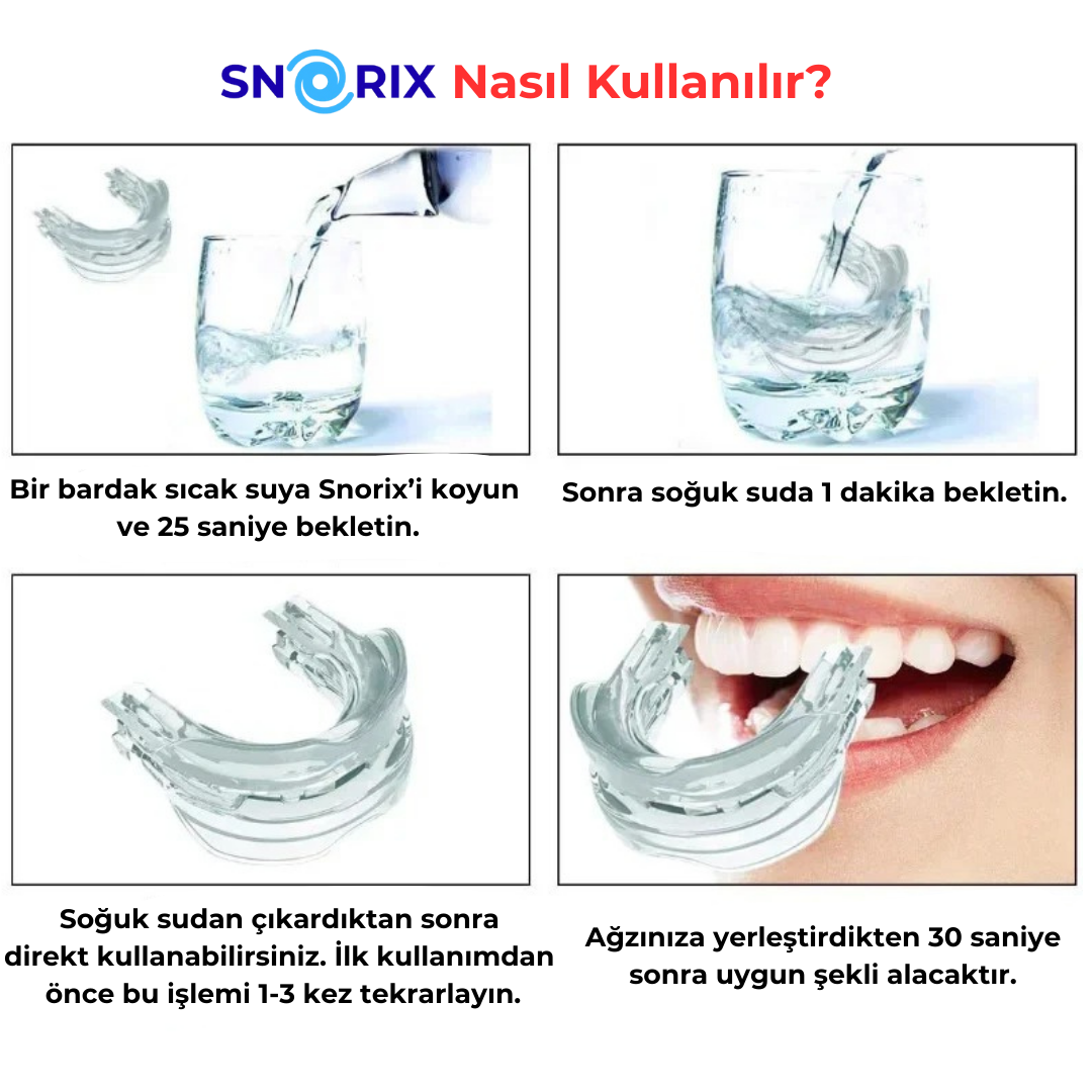 Snorix, yatmadan önce ağız içine yerleştirilir. Kullanımı kolaydır, makinesiz ve maskesizdir. Sabah çıkarılıp temizlenerek tekrar kullanılır.