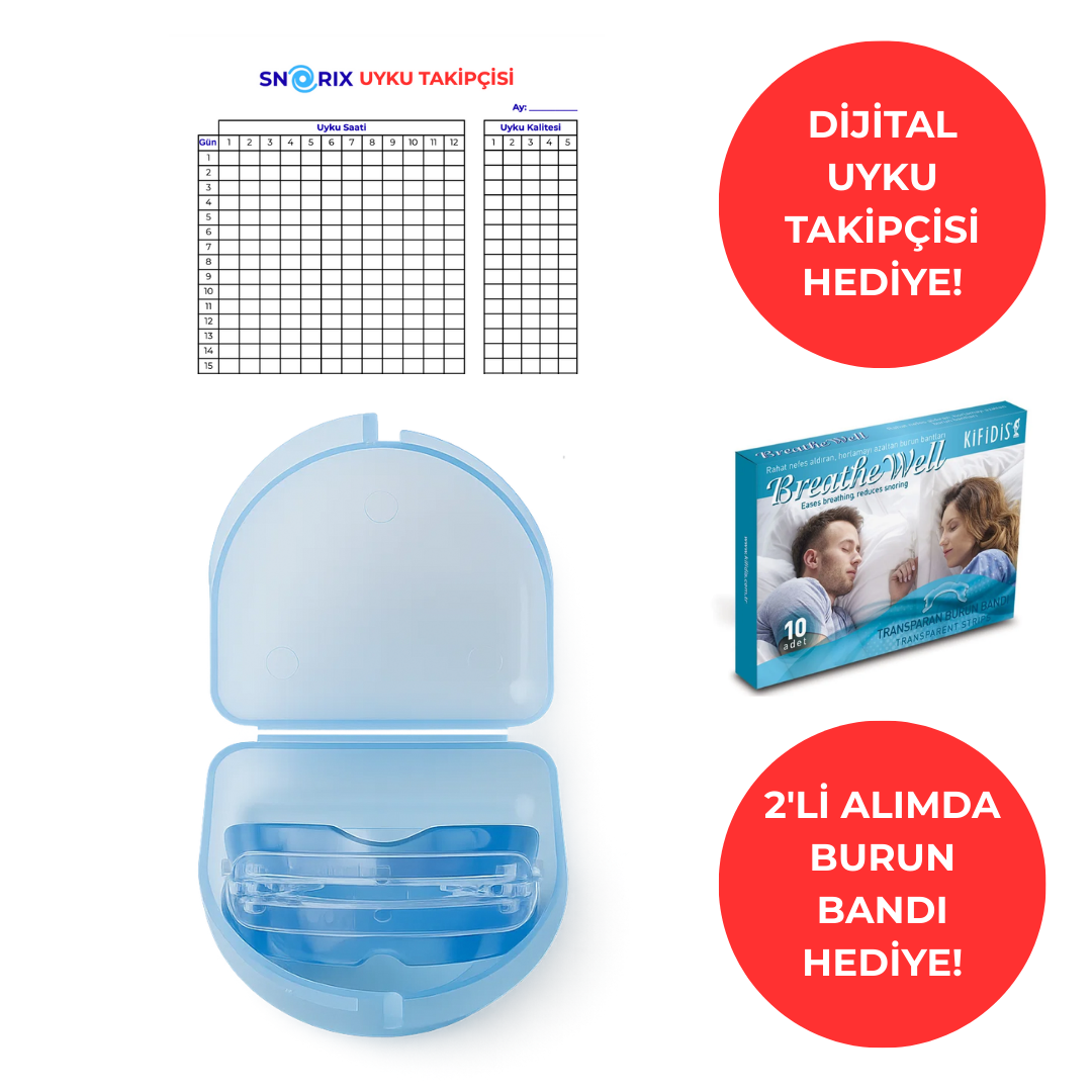 Snorix siparişinize özel olarak hazırlanmış “Horlamaya ve Uyku Apnesine Son” e-kitabını ücretsiz hediye ediyoruz. Bu dijital rehberde horlamayı azaltan egzersizler ve yaşam tarzı önerileri yer alıyor. E-kitabınıza siparişinizle birlikte hemen erişin!